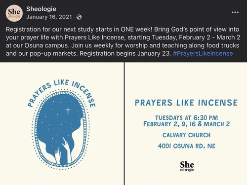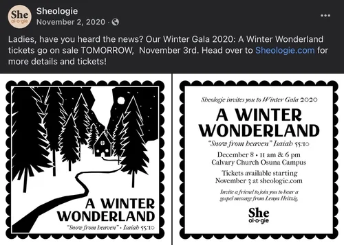During my time as the Social Media Coordinator at Calvary Church, I was tasked with running the social media for the women’s ministry, She.ol.o.gie. Managing this account was extremely enjoyable and allowed me a lot of creative freedom that only helped grow my creating and curating skills. Included on this page are screenshots of what some of the Instagram feed looking like during my time managing the account and examples of how the Facebook page was utilized for event promotion.